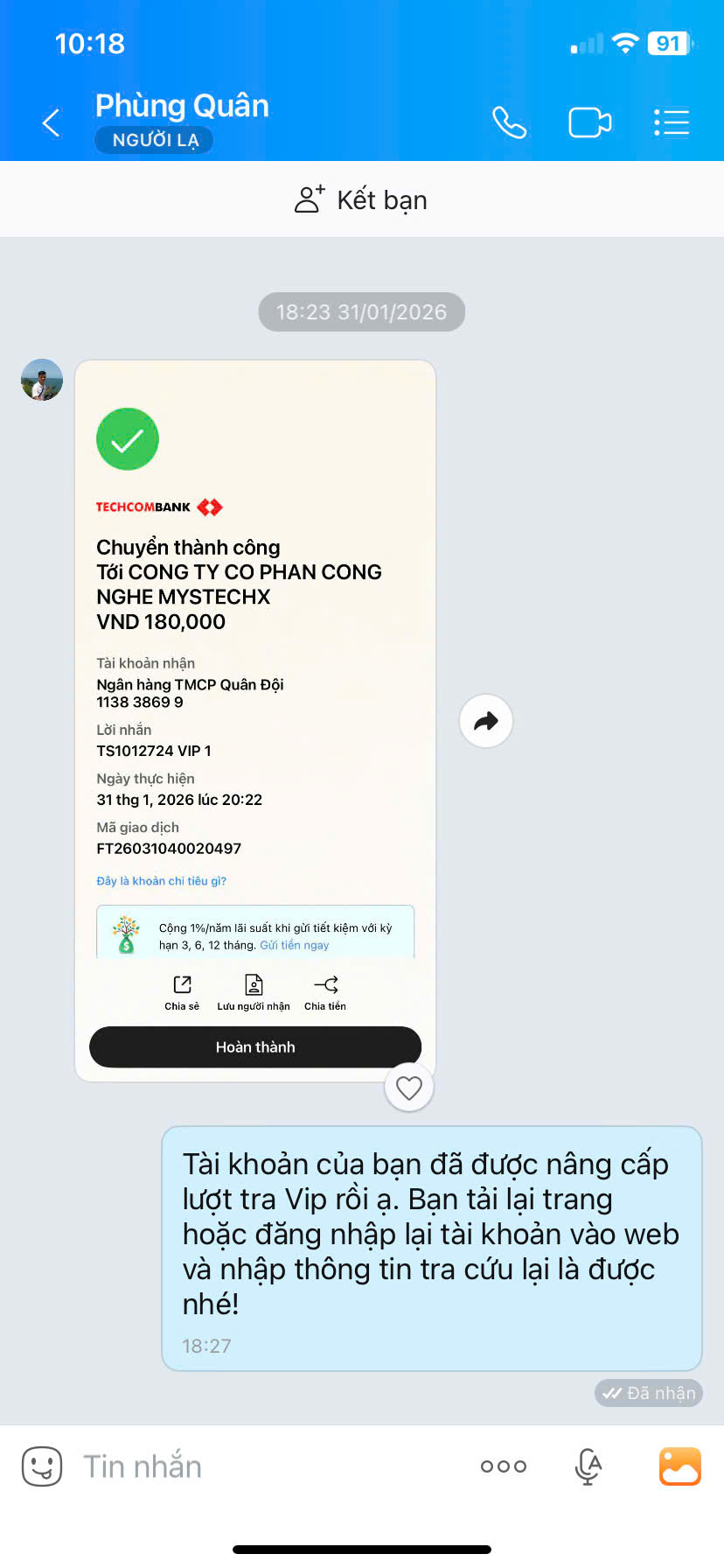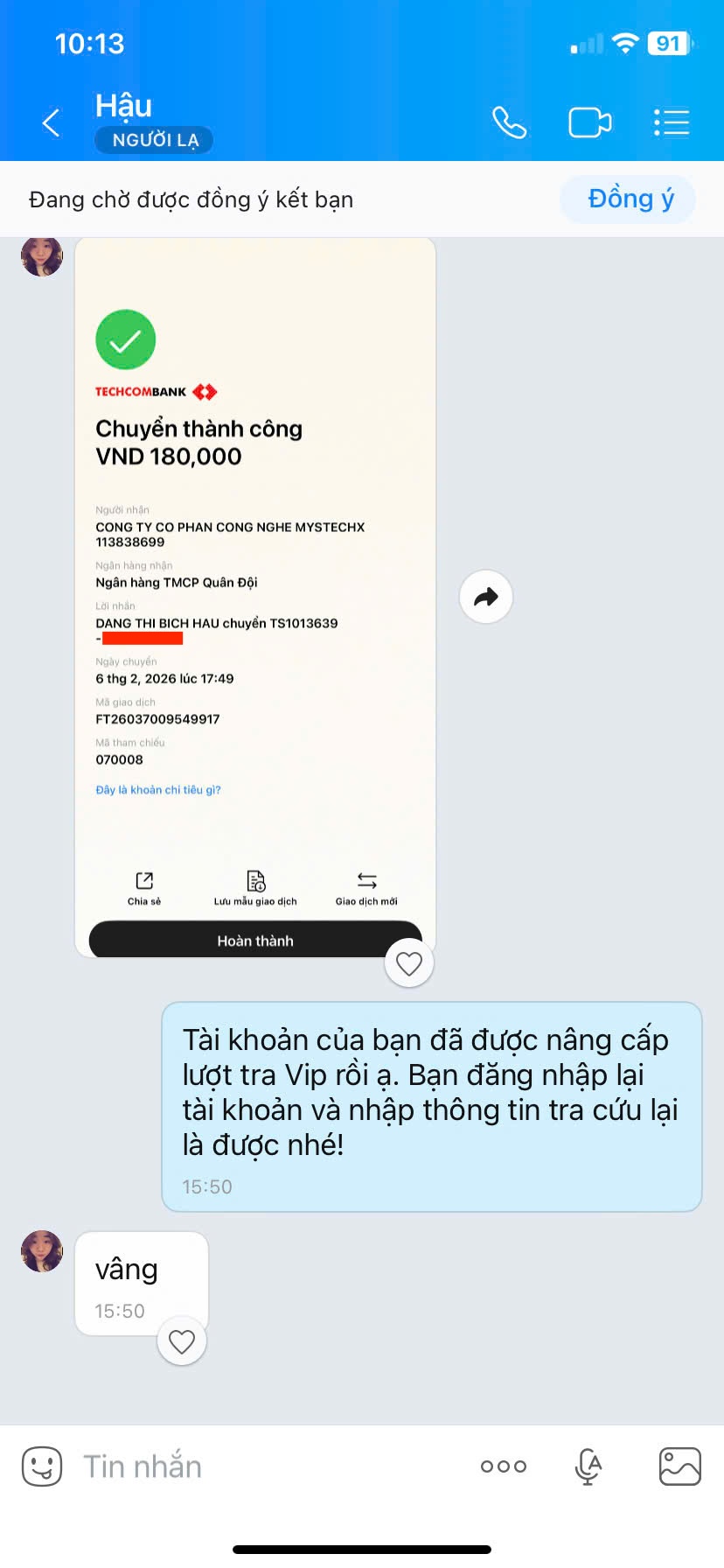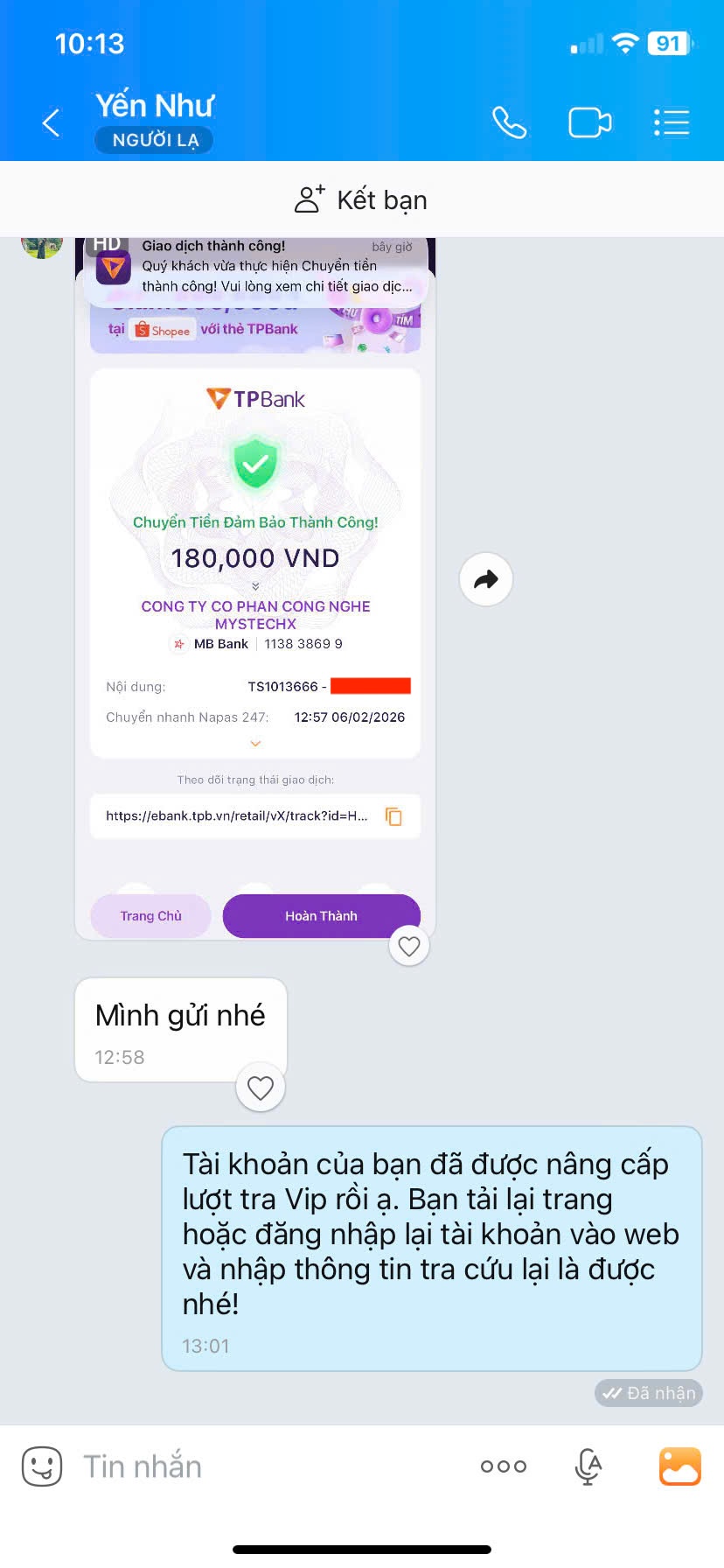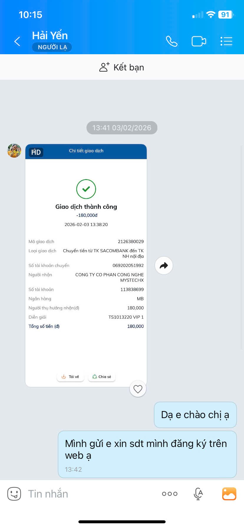 Chủ tài khoản: CONG TY CO PHAN CONG NGHE MYSTECHX