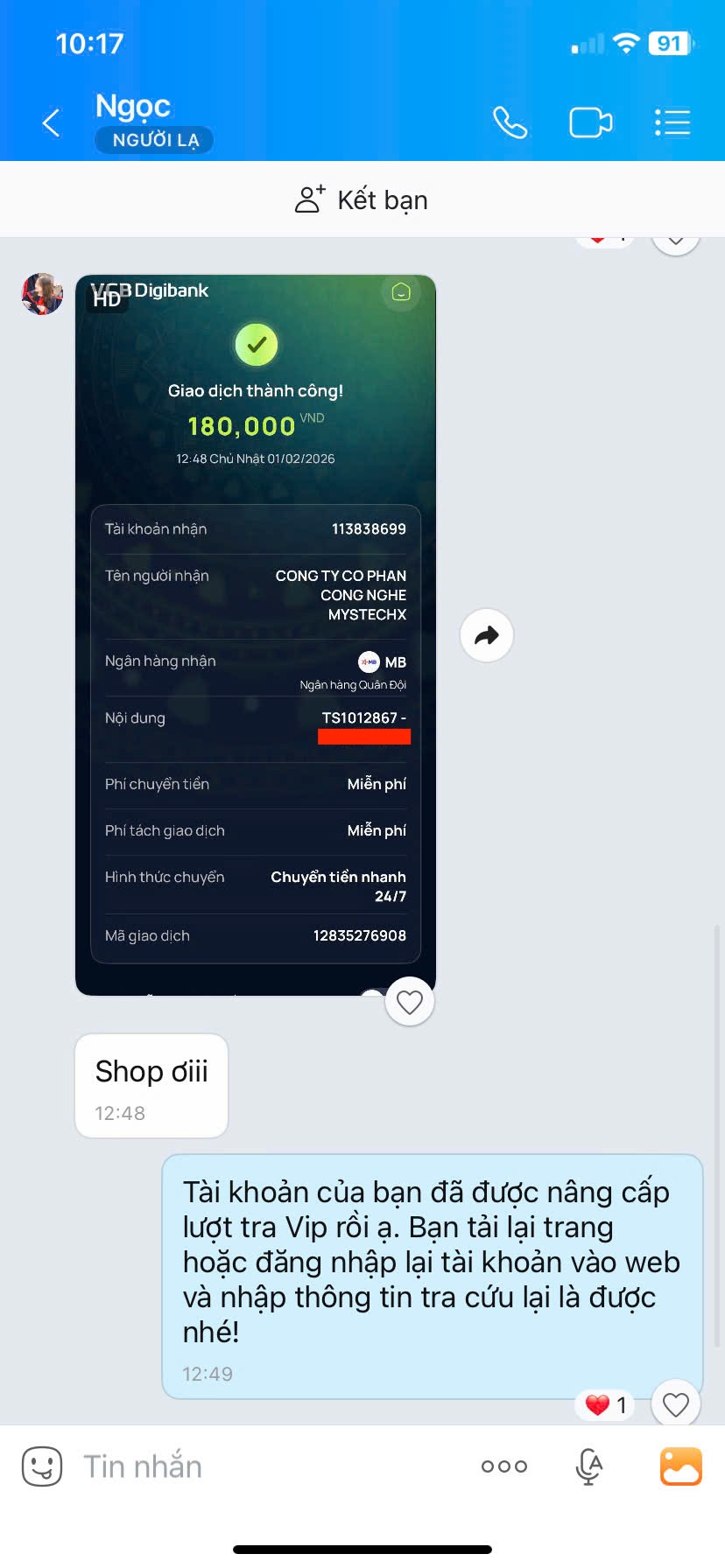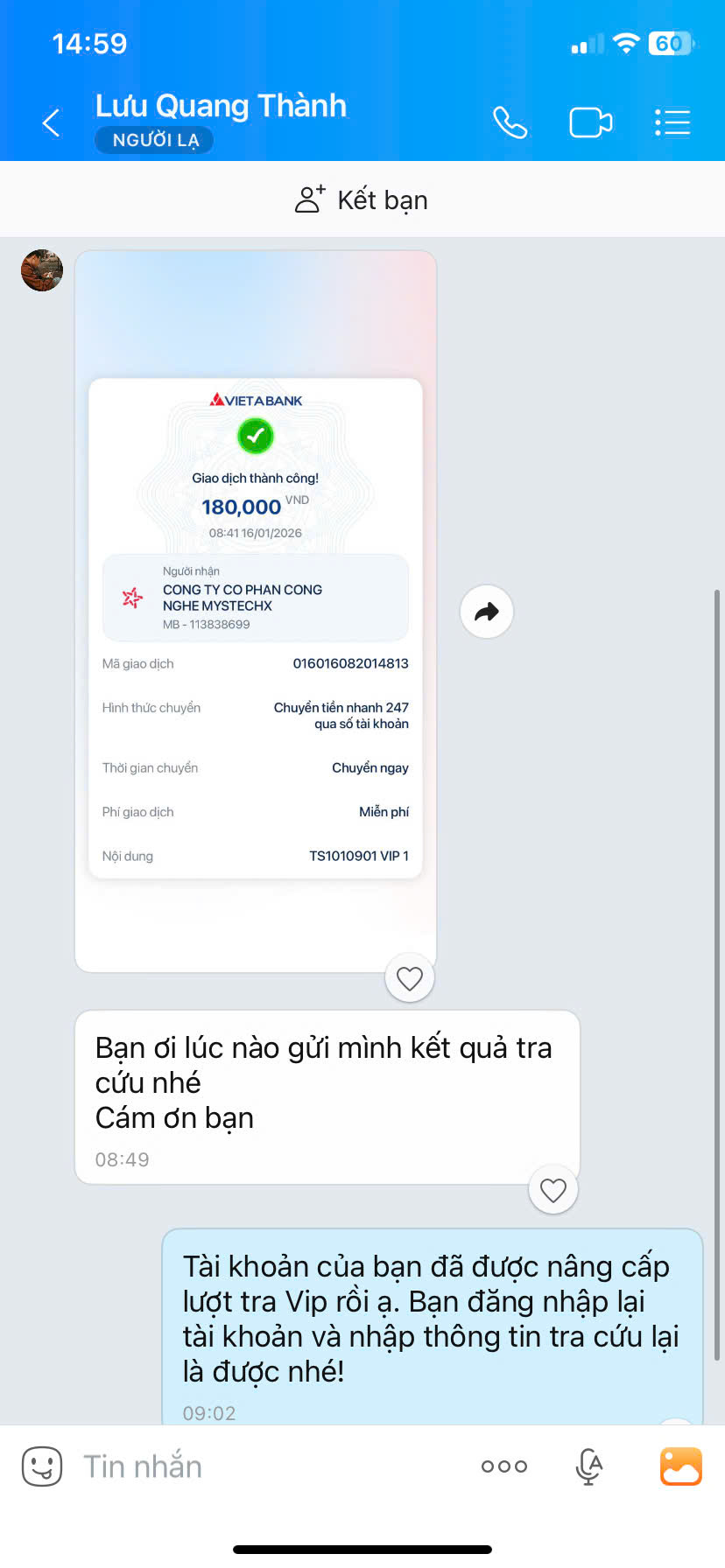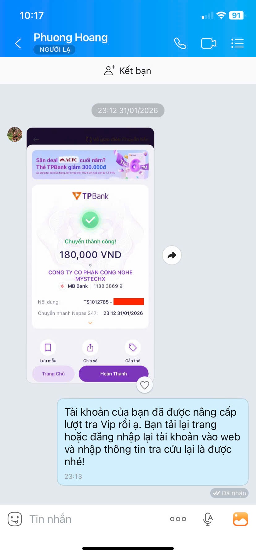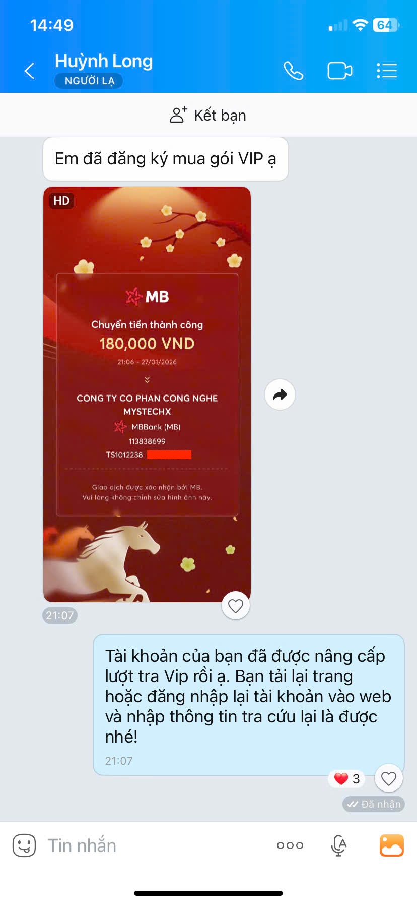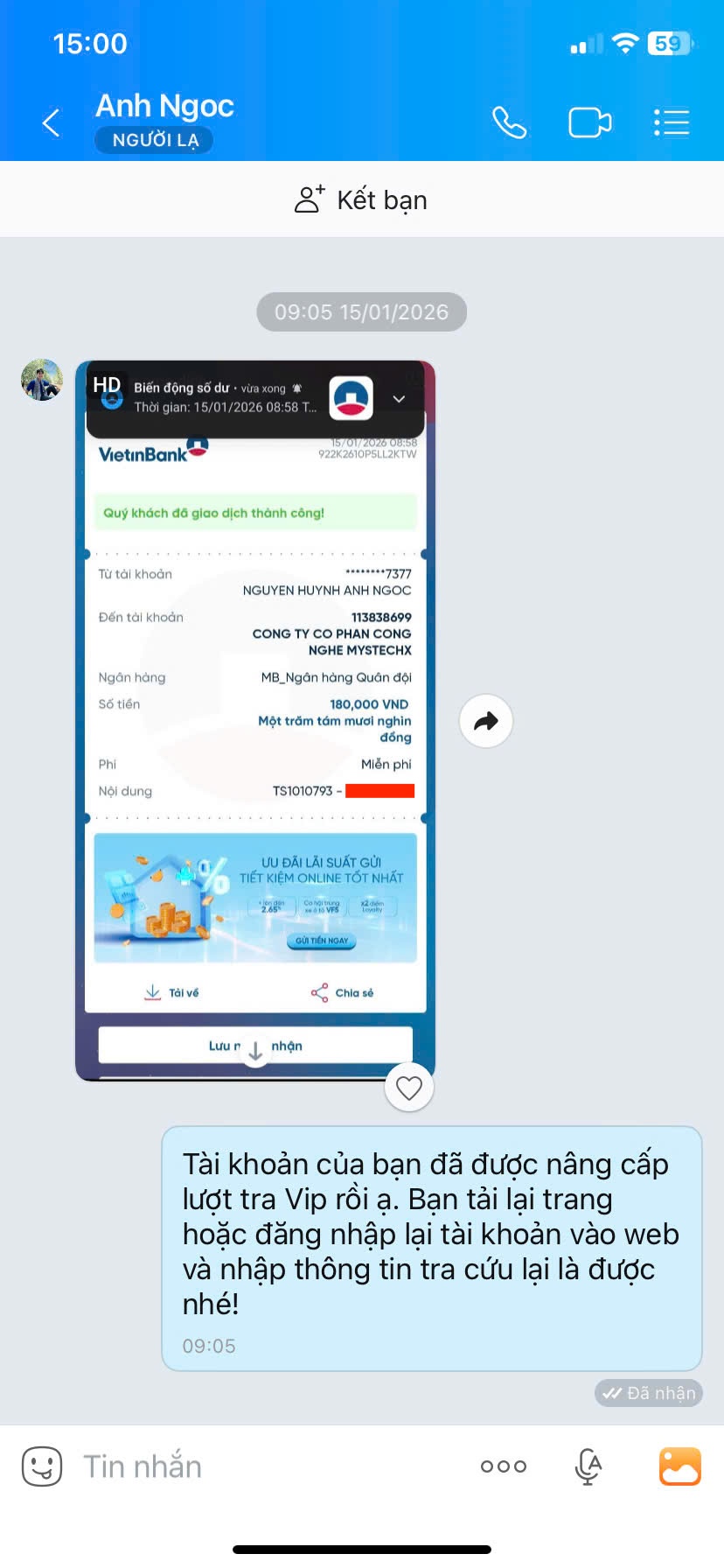 - Nếu thanh toán chuyển khoản, bạn vui lòng gửi ảnh giao dịch qua hotline để được kích hoạt VIP.